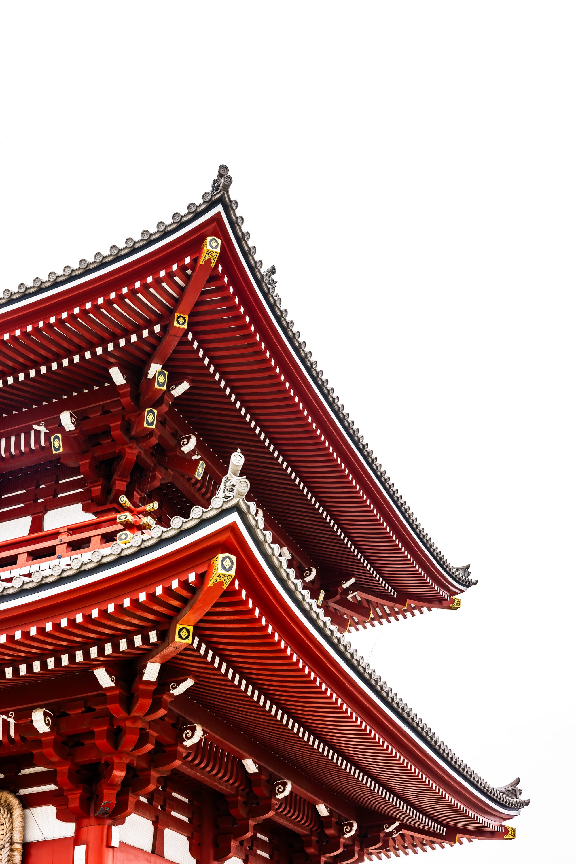 The bold vermilion beams cut sharply against a soft, washed out, empty sky. The layered rooflines, almost floating, reveal the precision and symmetry that define traditional Japanese architecture. Every joint, every curve, every ornamental detail feels intentional; crafted not just for structure, but for beauty.